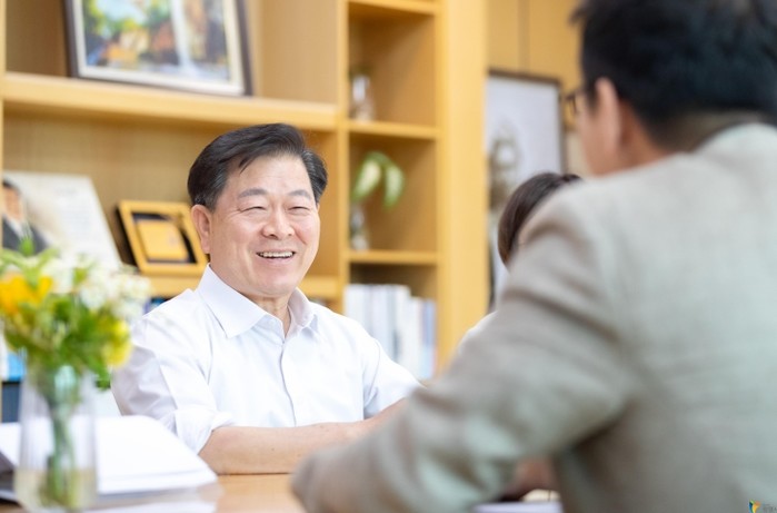 | ▲ 박승원 광명시장이 지난 6월 시장실에서 열린 민생안정지원금 효과분석 연구용역 착수보고회에서 연구원들과 소통하고 있다. |