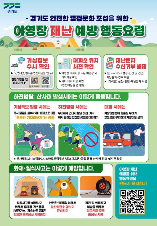 [코리아 이슈저널=홍춘표 기자] 경기도는 예측이 어려운 기상상황에 대비해 야영장 이용객의 신속한 대피를 돕기 위한 행동요령 홍보물 10만 8천 부를 제작해 야영장 등에 배포했다고 22일 밝혔다.