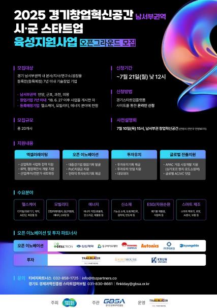 [코리아 이슈저널=홍춘표 기자] 경기도와 경기도경제과학진흥원은 경기 남서부권 스타트업 육성을 위해 ‘2025년 남서부권 경기창업혁신공간 오픈그라운드’ 참가기업을 모집한다.