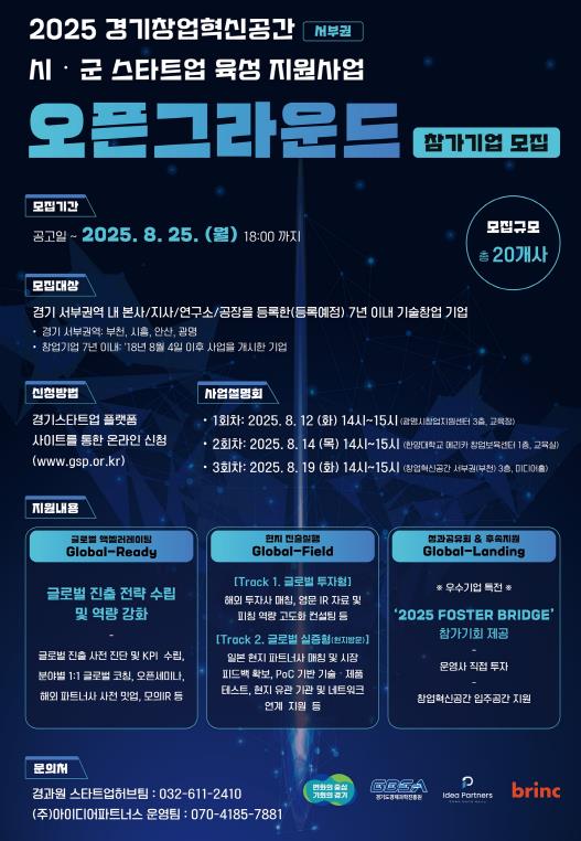 선정된 기업은 경기도 부천시에 위치한 서부권 경기창업혁신공간에서 오픈그라운드 프로그램에 참여하게 되며 해외진출 및 투자유치를 위한 ▲역량강화 교육 ▲IR 피칭 ▲해외 실증(PoC) 연계 ▲네트워킹 프로그램 등을 지원받을 수 있다.