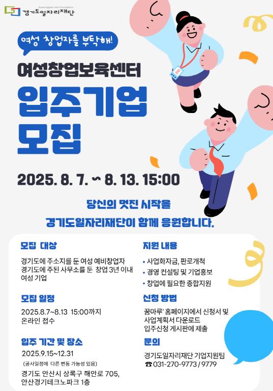 [코리아 이슈저널=홍춘표 기자] 경기도일자리재단이 여성 창업 생태계 활성화와 유망 여성 창업기업의 성장을 지원하기 위해 오는 8월 7일부터 13일 오후 3시까지 ‘2025년 경기도여성창업보육센터’ 신규 입주기업을 모집한다.