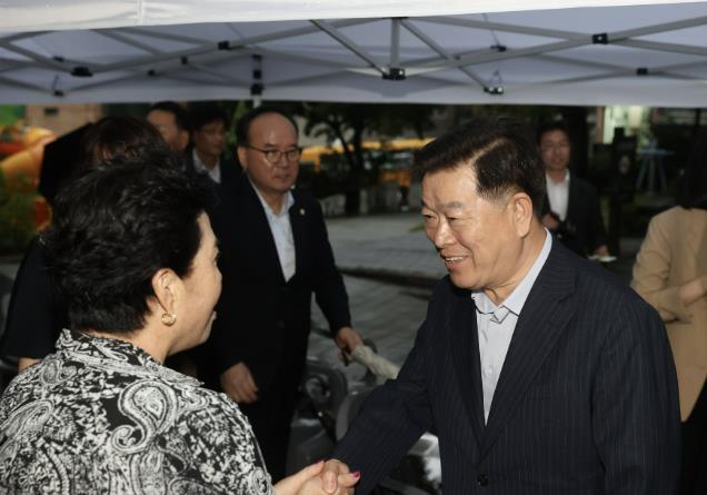 | ▲ 박승원 광명시장(사진 오른쪽)이 지난 13일 열린 소하2동 골목 경관 개선 사업 준공식에 참석해 지역 주민과 인사를 나누고 있다. |