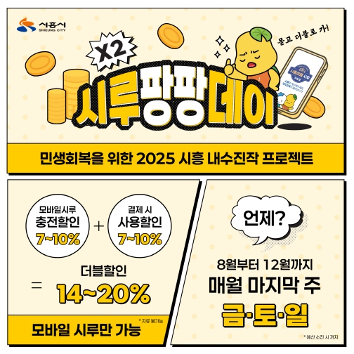 시흥시의 2025년 하반기 민생회복 프로젝트 ‘흥해라 흥세일’의 핵심 이벤트인 시루팡팡데이는 시흥시 지역화폐 모바일 ‘시루’ 충전 시 7~10%를 할인받고, 시루 가맹점에서 결제 시 추가로 7~10%를 할인받는 2배 할인 행사다.