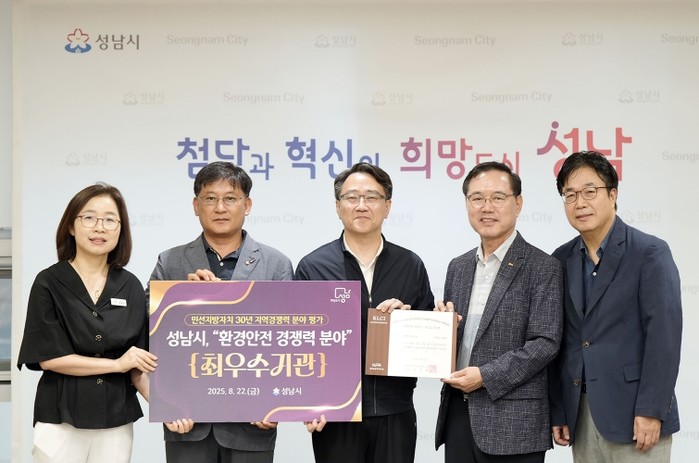 [코리아 이슈저널=홍춘표 기자] 성남시는 한국공공자치연구원이 주최한 ‘민선지방자치 30년 지역경쟁력 평가’에서 환경안전 경쟁력 분야 전국 1위를 차지해 최우수 인증패를 받았다고 25일 밝혔다.
