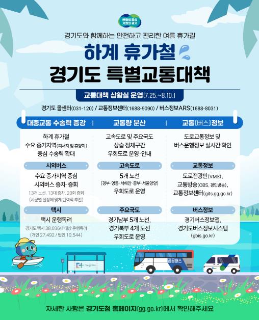 [코리아 이슈저널=홍춘표 기자] 경기도가 여름 휴가철 교통수요 증가에 대비해 7월 25일부터 8월 10일까지를 ‘2025년도 여름 휴가철 특별교통대책기간’으로 지정하고 대중교통 수송력 확대, 각종 교통정보 제공 등 특별교통대책을 시행한다.