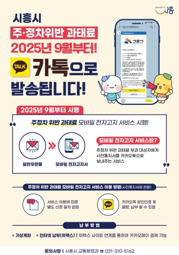 [코리아 이슈저널=홍춘표 기자] 시흥시는 오는 9월부터 ‘주정차 위반 과태료’ 고지서를 전자문서(카카오톡)로 발송하는 ‘모바일 전자고지 서비스’를 정식으로 운영한다.