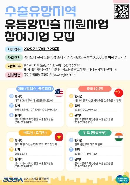 박경서 경기도 국제통상과장은 “이번 지원사업은 도내 중소기업이 세계 시장에서 안정적으로 뿌리내릴 수 있도록 준비한 것”이라며 “앞으로도 변화하는 무역환경에 대응해 수출 확대를 위한 다양한 지원을 아끼지 않겠다”고 말했다.