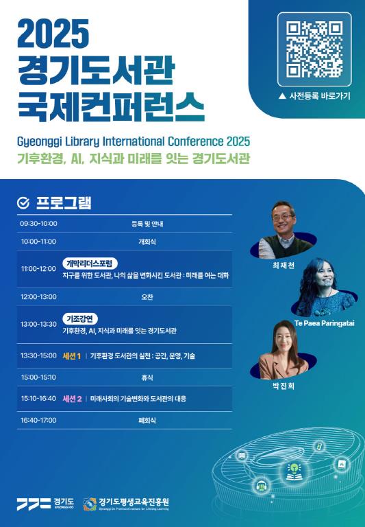 [코리아 이슈저널=김윤영 기자] 경기도와 경기도평생교육진흥원은 오는 23일 수원컨벤션센터 컨벤션홀3에서 ‘기후환경, AI, 지식과 미래를 잇는 도서관’을 주제로 ‘2025 경기도서관 국제콘퍼런스’를 개최한다.