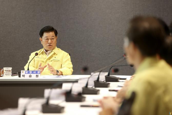 | ▲ 박승원 광명시장이 지난 8월 시청 컨퍼런스룸에서 열린 소하동 아파트 화재 관련 현안회의를 주재하고 있다. |