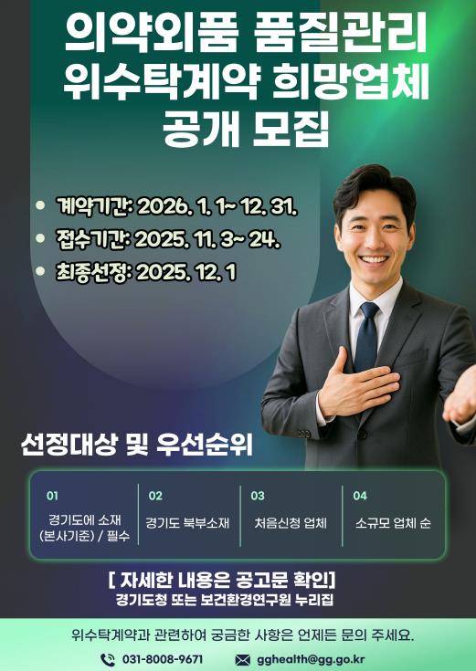 [코리아 이슈저널=홍춘표 기자] 경기도보건환경연구원은 오는 24일까지 ‘2026년 의약외품 품질검사 위·수탁계약’ 참여를 희망하는 제조·수입업체를 모집한다.