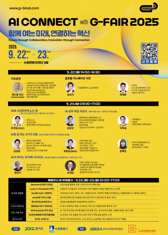 [코리아 이슈저널=홍춘표 기자] 경기도는 22일부터 23일까지 수원컨벤션센터에서 인공지능(AI)과 실생활의 융합을 주제로 한 ‘AI Connect with G-FAIR 2025(에이아이 커넥트 위드 지페어)’를 개최한다.