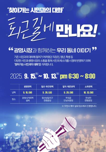 이번 행사는 ▲광명권(9. 15., 광명사거리역 쉼터) ▲철산·하안권(9. 26., 철산상업지구 원형광장) ▲일직·학온권(9. 29., 무의공 만남의 광장) ▲소하권(10. 13., 한내천 원형광장) 순으로 오후 6시부터 8시까지 진행된다.