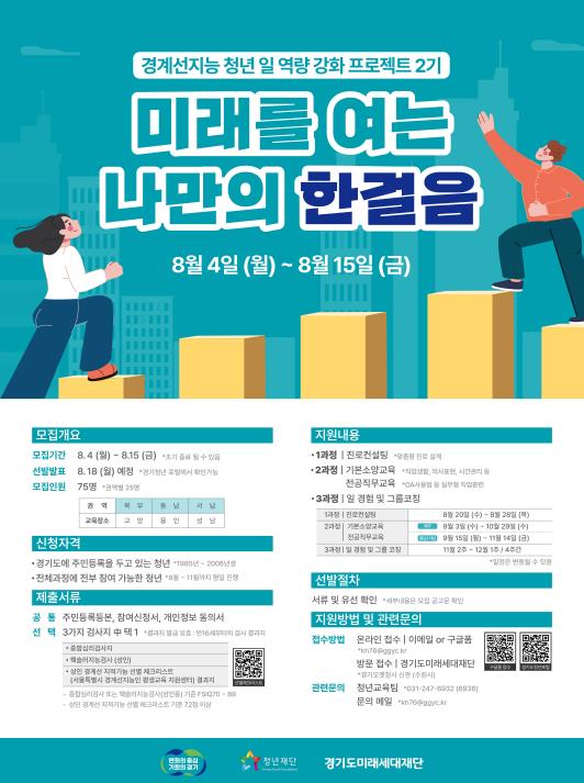 모집 대상은 경기도에 거주하는 만 19세부터 39세까지의 청년으로, 북부·동남·서남 권역에서 선착순 총 75명을 선발한다. 선발된 참여자는 약 4개월간 과정별로 구성된 프로그램에 참여하게 된다.
