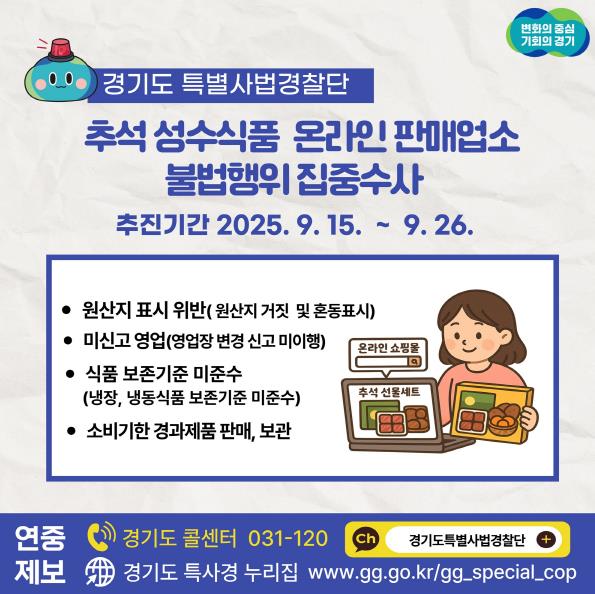 [코리아 이슈저널=홍춘표 기자] 경기도는 9월 15일부터 26일까지 추석 명절을 앞두고 성수식품 온라인 판매업소 360곳을 집중 수사한다고 밝혔다.