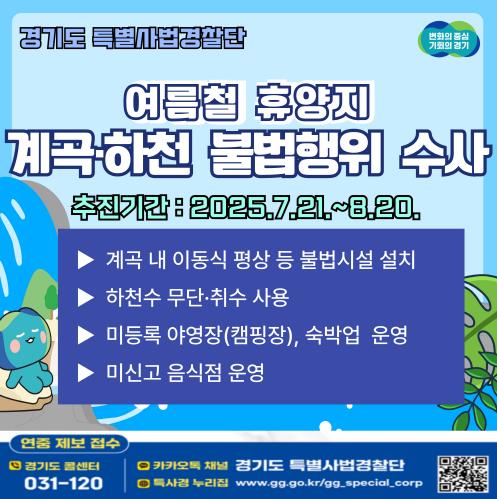 [코리아 이슈저널=홍춘표 기자] 여름 휴가철을 맞아 경기도가 7월 21일부터 8월 20일까지 도내 주요 계곡과 하천 등 휴양지에서 발생하는 불법행위를 집중 단속한다.