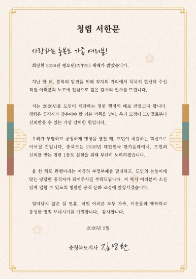 [코리아 이슈저널=홍종수 기자] 김영환 충북도지사가 2026년 병오년(丙午年)을 ‘도민이 체감하는 청렴 행정의 해’로 만들겠다는 의지를 담은 청렴서한문을 전 직원에게 발송하고, 올 한 해 청렴 실천을 당부했다.