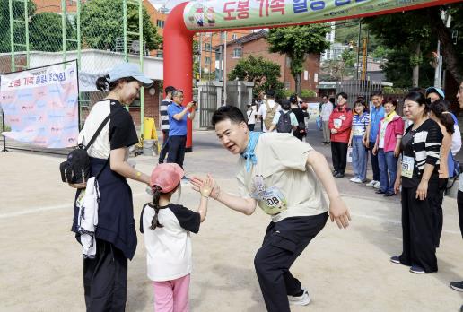 | ▲ 오언석 도봉구청장이 ‘도봉 가족 힐링 등산대회’ 시작점에서 아이와 하이파이브를 하고 있다. |