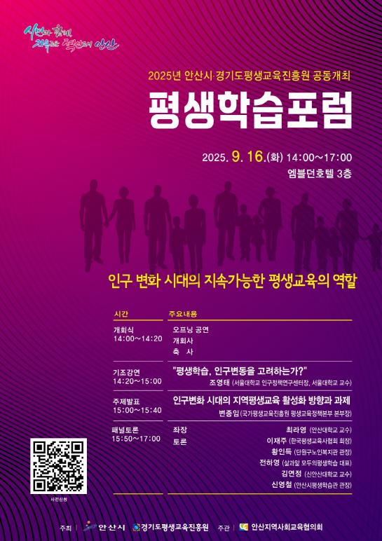 [코리아 이슈저널=김윤영 기자] 경기도평생교육진흥원은 16일 안산 엠블던호텔에서 안산시와 공동으로 ‘인구 변화 시대의 지속가능한 평생교육의 역할’을 주제로 평생학습포럼을 열었다.