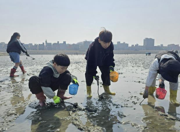 | ▲ 아이들이 갯벌에서 조개 캐기 체험을 하고 있다. |