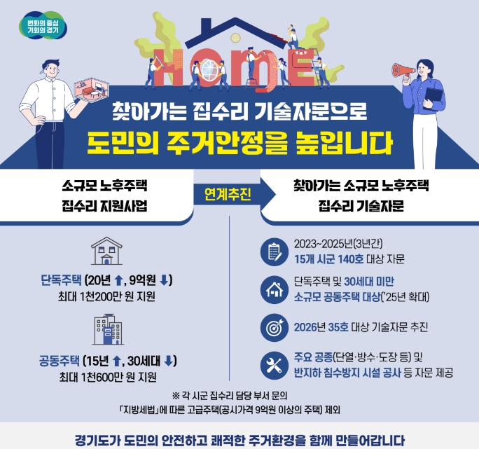 [코리아 이슈저널=홍춘표 기자] 경기도가 소규모 노후주택에 거주하는 도민들의 집수리 고민을 덜어주기 위해 찾아가는 무료 기술자문을 올해는 35곳에서 추진한다.
