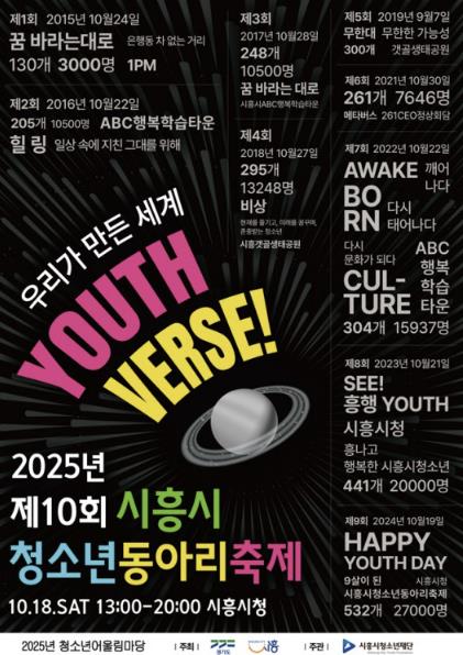 [코리아 이슈저널=김윤영 기자] 10주년을 맞은 시흥시청소년동아리축제가 오는 10월 18일 시흥시청에서 개최된다. ‘우리가 만든 세계: YOUTHVERSE’를 주제로 열리는 이번 축제는 지난 10년간의 활동을 돌아보는 동시에 앞으로 축제가 나아가야 할 길을 내다보는 전환점이 될 것으로 보인다.