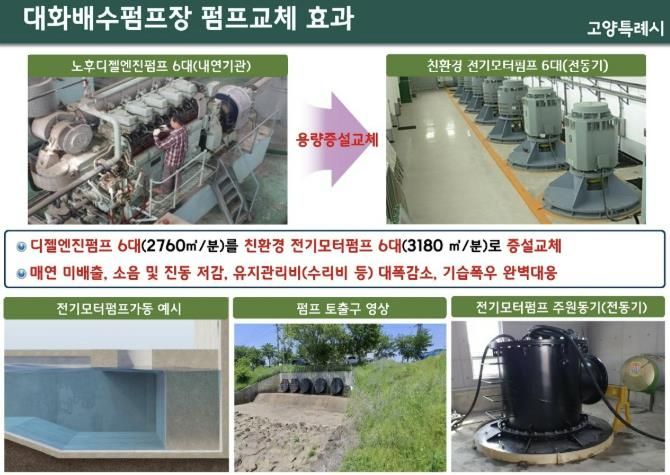 대화지구도 대화 제1배수펌프장의 노후 디젤엔진펌프 6대를 전기모터펌프 6대로 교체해 소음, 진동, 매연 저감은 물론 폭우 대응 능력과 유지 효율이 향상될 전망이다. 2027년 준공 예정으로, 50년 빈도 기준 3시간, 182㎜의 폭우를 견딜 수 있게 된다.