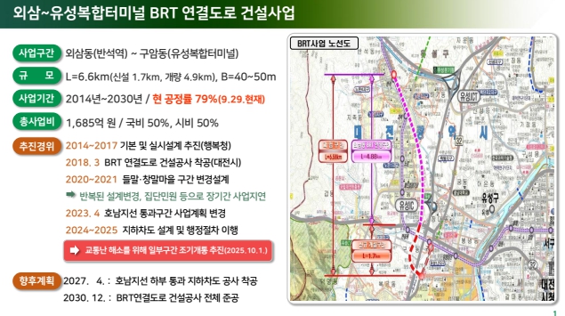 시는 29일 시청 기자실에서 브리핑을 열고 오는 10월 1일부터 외삼~유성복합터미널 BRT 연결도로를 임시 개통하고, 유성IC~장대교차로~구암교네거리~구암역삼거리 일원 교통 개선을 추진한다고 밝혔다.