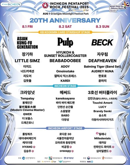 [코리아 이슈저널=김윤영 기자] 인천광역시는 인천시가 주최하고, 인천관광공사와 경기일보가 공동 주관하는 ‘2025 인천펜타포트 락 페스티벌’이 20주년을 맞아 오는 8월 1일부터 8월 3일까지 송도달빛축제공원에서 성대하게 열린다고 밝혔다.