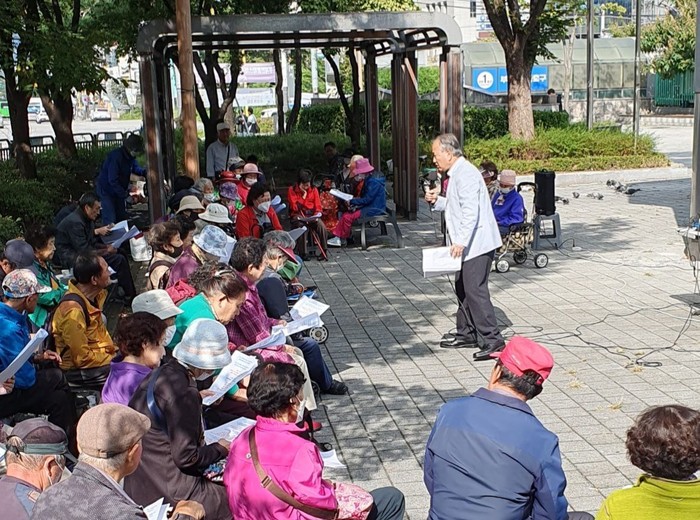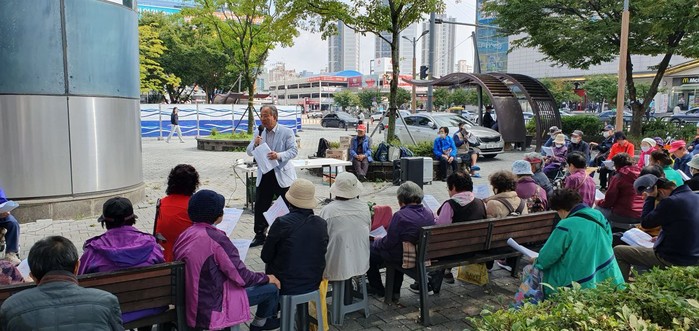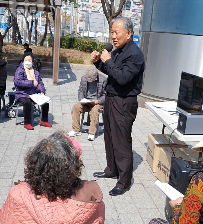 | ▲부평광장에서 독거노인들에게 설교하는 조영광목사 모습 ( 본인 사진제공 ) |