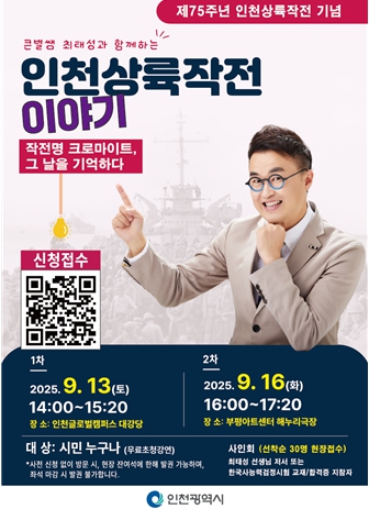 [코리아 이슈저널=홍춘표 기자] 인천광역시는 인천상륙작전 75주년을 기념해 대한민국 대표 한국사 강사 큰별쌤 최태성과 함께하는‘작전명 크로마이트, 그날을 기억하다’를 개최한다고 밝혔다.