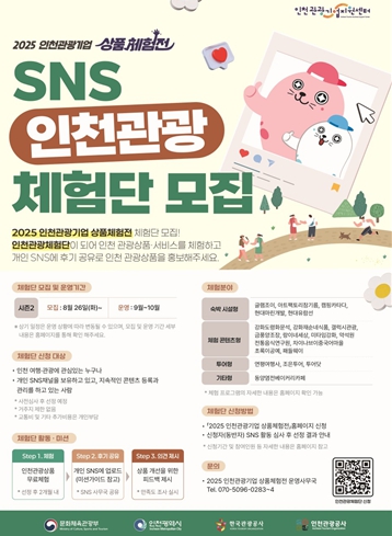 [코리아 이슈저널=홍춘표 기자] 인천광역시와 인천관광공사는 인천 관광기업의 판로확대와 마케팅 지원을 위한 ‘2025 인천관광기업 상품체험전(이하, 체험전)’시즌2 체험단 모집을 8월 26일부터 시작했다고 밝혔다.