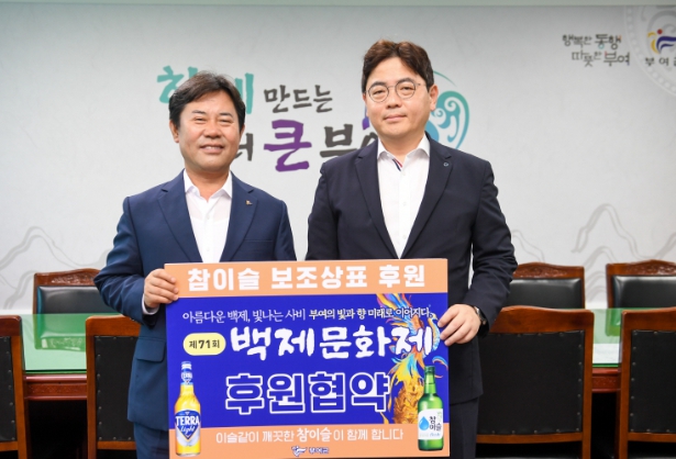 [코리아 이슈저널=홍종수 기자] 부여군은 지난 9월 26일 군수실에서 제71회 백제문화제 보조 상표 후원식을 열고, 국내 대표 주류기업인 하이트진로(주)와 함께 축제 성공을 위한 상생 협력의 자리를 가졌다.