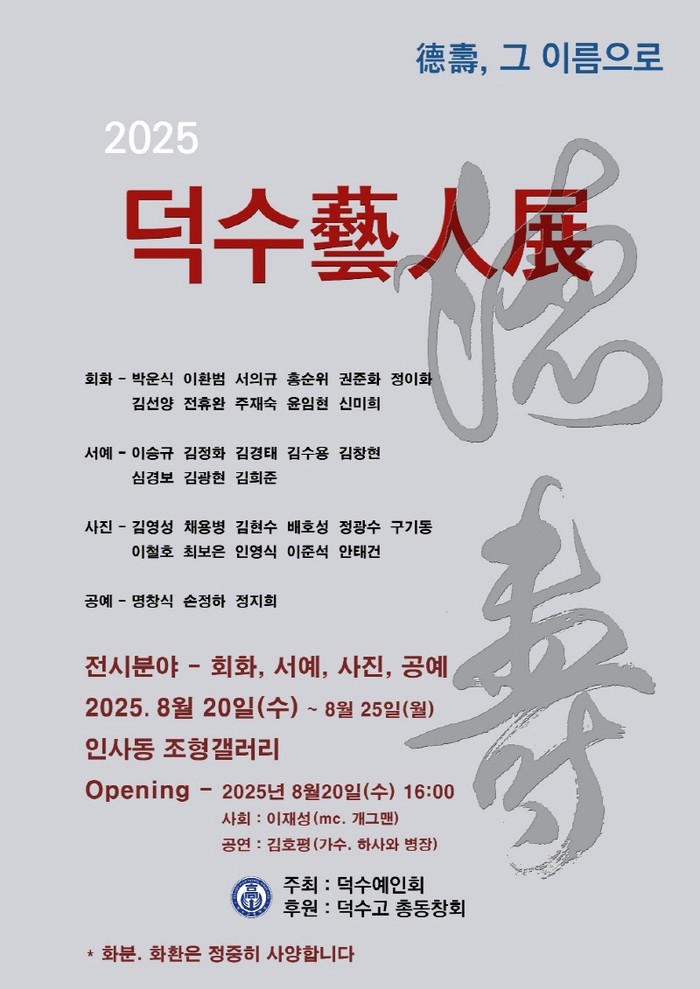 덕수고는 1910년 수하동에서 개교하여 올해 113회 졸업생을 배출해오며, 금융사관학교로, 야구 명문고로 널리 알려져 있다. 덕수 예인회 관계자는 각종 예술 분야에서도 동문 작가들의 활약이 뛰어난 바를 널리 알리고자 매년 전시회를 개최하고 있으니 많은 관심과 응원을 부탁드린다고 전했다.