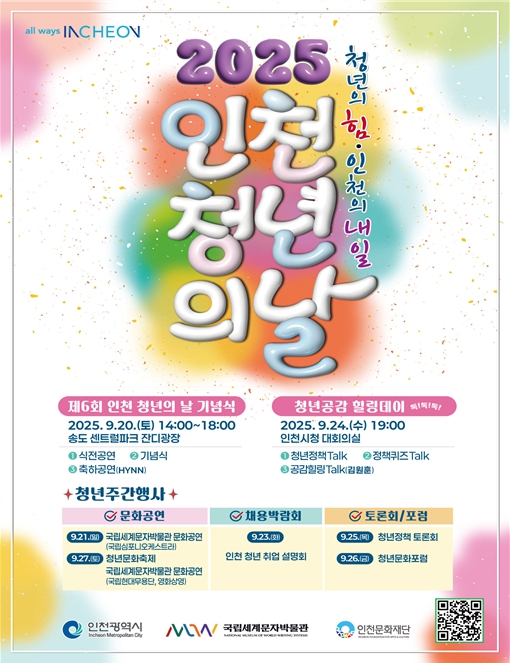 [코리아 이슈저널=홍춘표 기자] 인천광역시는 9월 20일부터 27일까지 ‘2025년 인천 청년주간’을 운영하며 ‘청년의 힘! 인천의 내일’을 주제로 청년과 시민 모두가 함께하는 축제의 장을 마련한다고 밝혔다.