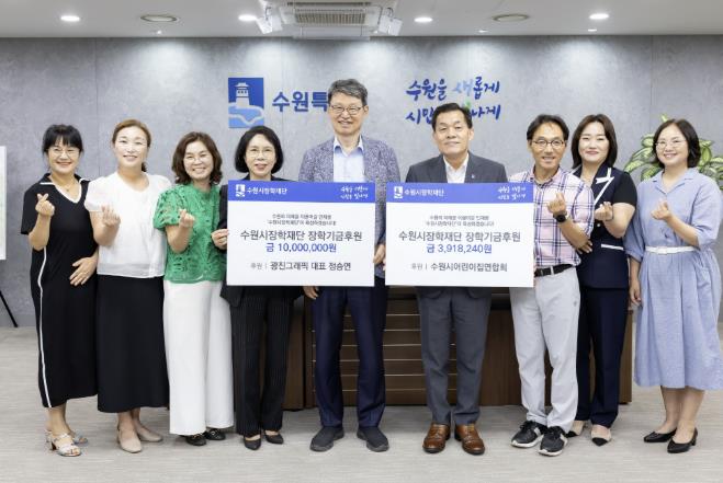 [코리아 이슈저널=홍춘표 기자] 정승연 수원시장학재단 이사와 수원시어린이집연합회가 수원시장학재단에 장학금을 기탁했다. 정승연 이사가 1000만 원, 수원시어린이집연합회는 연합회 소속 어린이집 원아들이 모은 391만 원을 기부했다.