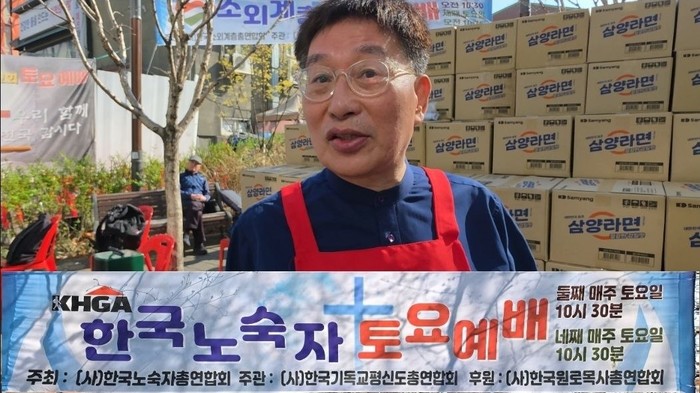 | ▲ 31일 사랑이 라면 증정식에 참석한 김화경목사가 매주 토요일 진행하는 '한국노숙자 토요예배' 현수막을 펼쳐보이고 있다. |