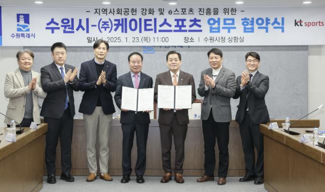 | ▲ 지난 1월 수원시와 ㈜케이티스포츠가 업무협약을 맺고 이재준 수원시장(오른쪽 세 번째)과 참석자들이 기념촬영을 하고 있다. |