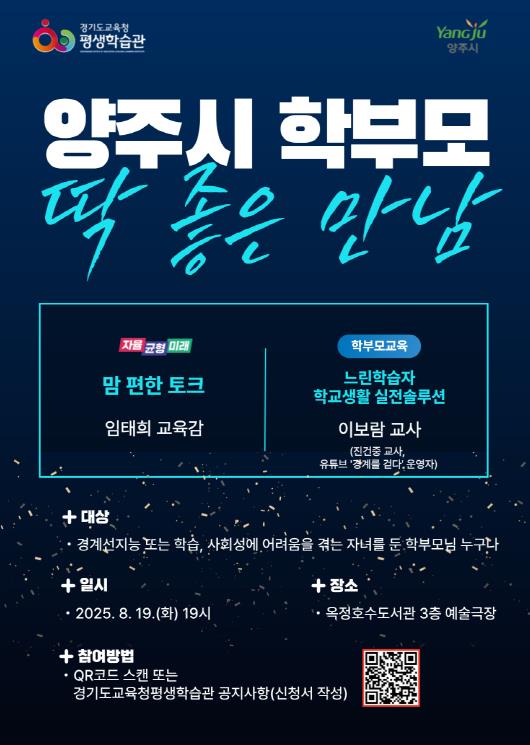 오는 19일부터 10월 25일까지 진행되는 이번 프로그램은 평생학습관은 지역의 평생교육 활성화와 학부모교육 확대를 위해 협약을 체결한 기기관(양주·수원·오산시)을 거점으로 진행된다.