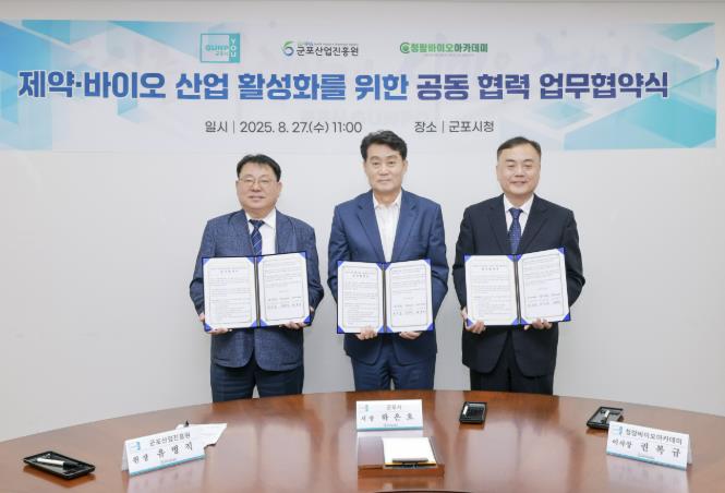 [코리아 이슈저널=홍춘표 기자] 군포시는 8월 27일 시청 회의실에서 군포산업진흥원, 청람바이오아카데미와 제약·바이오·헬스케어 산업 활성화 및 지역 인재 양성을 위한 3자 업무협약을 체결했다.