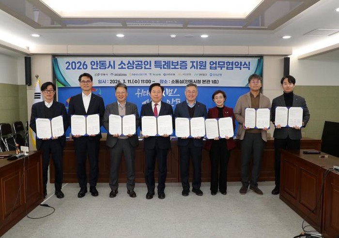 [코리아 이슈저널=김태훈 기자] 안동시는 3월 11일 시청 소통실에서 경북신용보증재단 및 6개 협약은행과 함께 '2026년 안동시 소상공인 특례보증 지원 업무협약'을 체결했다.