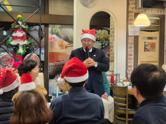 박강수 마포구청장이 16일 신수동 주민자치위원회 송년회에 참석해 주민을 안전을 위한 봉사활동에 치하하고 있다.