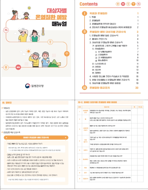 스스로 예방 활동이 어려운 대상군에 대한 점검 내용을 반영하여 ▲장애인 보호자 온열질환 예방수칙, ▲장애인 보호자용 온열질환 예방 점검표를 포함했다.