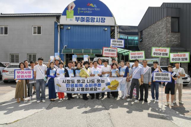 이날 캠페인은 박정현 부여군수를 비롯해 부여군 상인회가 주축이 되어 추진한 것으로, 참석자들은 어깨띠를 착용하고 소비 촉진 홍보물을 배포하면서 소비쿠폰 사용을 독려했다.