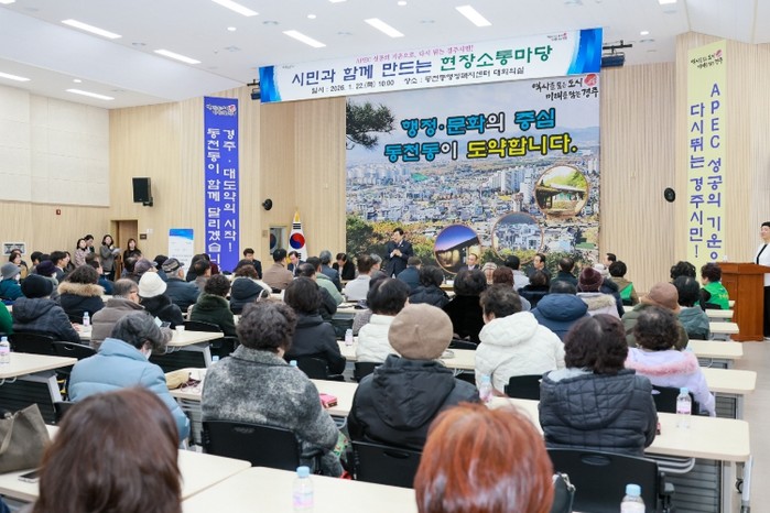 이날 동천동 행정복지센터와 보덕동 주민자치센터에서 열린 현장소통마당에는 주낙영 경주시장을 비롯해 최덕규 경상북도의회 의원, 임활 경주시의회 부의장, 정종문 경주시의회 경제산업위원회 위원장, 지역 기관·단체장, 주민대표 등 200여 명이 참석해 지역 현안과 시정 방향에 대해 다양한 의견을 나눴다.