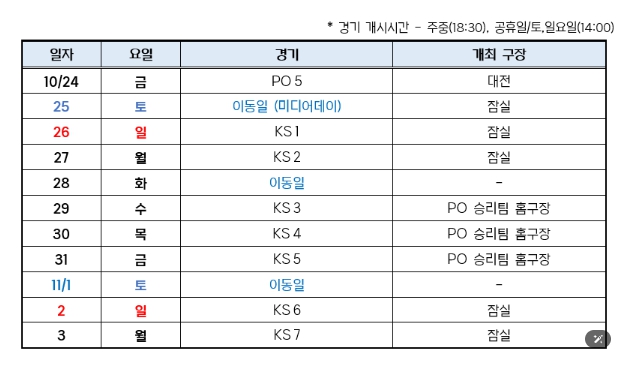 [코리아 이슈저널=최용달 기자] 삼성 라이온즈와 한화 이글스의 2025 신한 SOL뱅크 KBO 플레이오프 5차전이 10월 24일(금)에 개최된다. 따라서 포스트시즌 각 시리즈 간 최소 1일의 이동일이 확보되어야 하는 규정에 의거, 이후에 예정된 한국시리즈의 모든 일정이 하루씩 늦춰진다.
