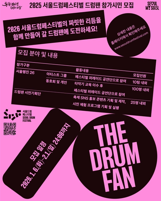 [코리아 이슈저널=최준석 기자] 서울시는 오는 5월 동대문디자인플라자(DDP)에서 개최되는 ‘2026 서울드럼페스티벌’을 앞두고 축제의 주인공으로 활약할 ‘드럼팬(Drum Fan)’ 시민 참여자를 2월 1일까지 모집한다. 올해 축제는 단순 관람을 넘어 시민이 직접 기획하고 참여하는 ‘시민 주도형’ 축제가 될 것으로 기대된다.