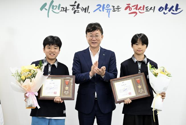 [코리아 이슈저널=홍춘표 기자] 안산시는 지난 18일 무더위 속 어르신을 도와 선한 영향력을 선사한 성호중학교 양시온(2학년), 유호현(2학년) 학생을 안산시청으로 초대해 표창장을 수여했다고 21일 밝혔다.