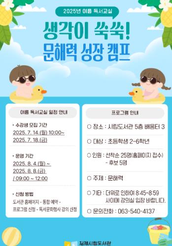 [코리아 이슈저널=김종오 기자] 김제시는 김제시립도서관이 여름방학을 맞아 관내 초등학생을 대상으로 문해력 향상 프로그램인 ‘생각이 쑥쑥! 문해력 성장 캠프’를 운영한다고 밝혔다