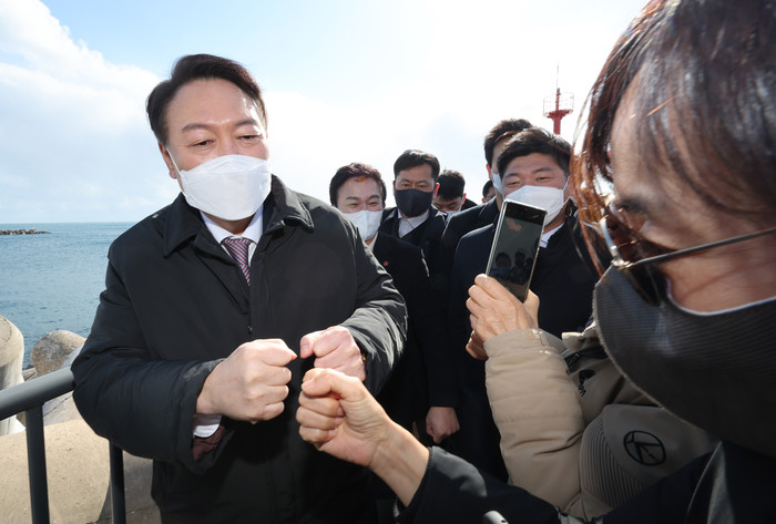 | ▲ 국민의힘 윤석열 대선 후보가 지난 5일 제주 해군기지가 있는 제주 서귀포시 강정마을을 방문해 입장문을 발표한 뒤 시민들과 주먹인사하고 있다. 2022.2.5 |
