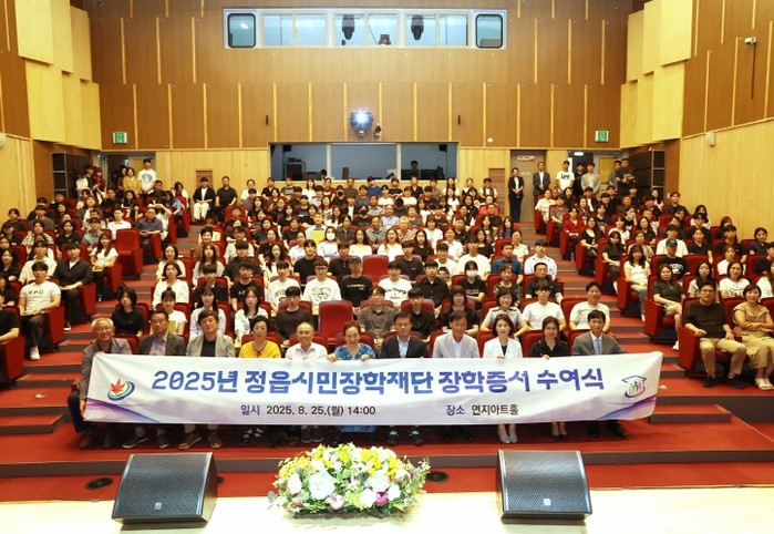 [코리아 이슈저널=김종오 기자] 정읍시민장학재단이 지난 25일 연지아트홀에서 ‘2025년 정읍시민장학재단 장학생 장학증서 수여식’을 열고 장학생 190명에게 총 4억 원을 전달했다.